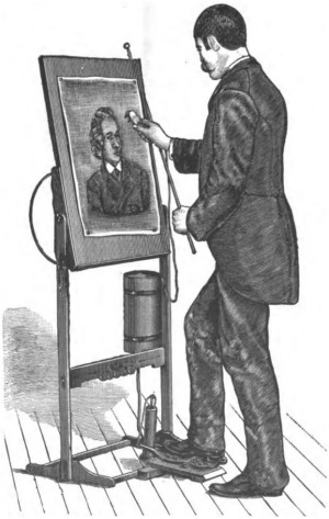 “The New Ideas in Illustration” (Artikel von W.A. Dwiggins, 1914) - Das Bild zeigt bereits 1914 eine Vorrichtung für Airbrush-Malerei. Leider ist nicht ersichtlich, wer der Erfinder ist und wer damit arbeitete. Es könnte sich allerdings um Alberto Vargas handeln.